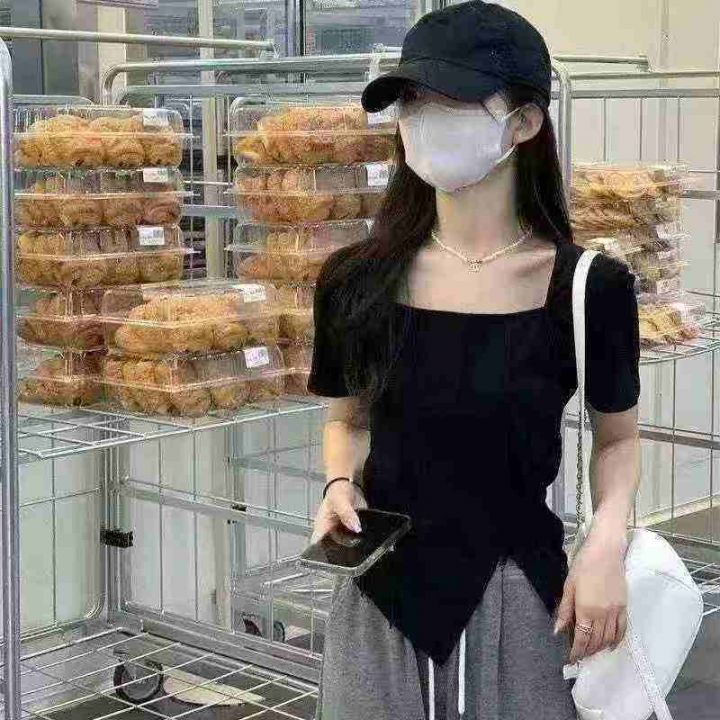 冰丝螺纹纯欲方领短袖t恤女2025夏季修身chic别致独特甜辣妹正肩短款上衣,1到6码,独立包装,货品干净,1000件左右,5.8清,分货加1