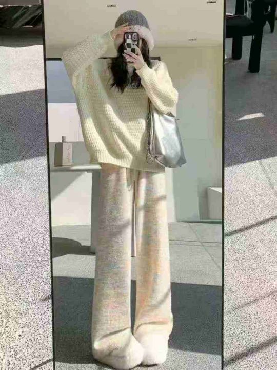 秋冬新款网红爆款韩系彩虹泡泡直筒阔腿糯米毛线裤,独...