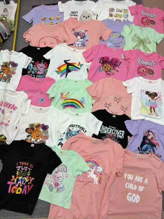 全清2.98元,18800件\'童装短袖T恤,卡通彩色图案童装短袖T恤,花型大同小异一系列\'独立包装,码数90-160,分货200起3.5元