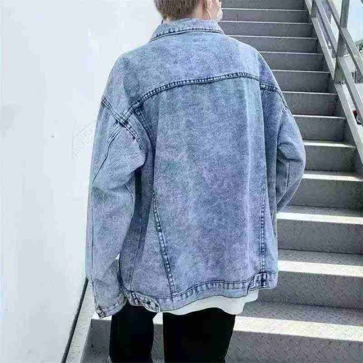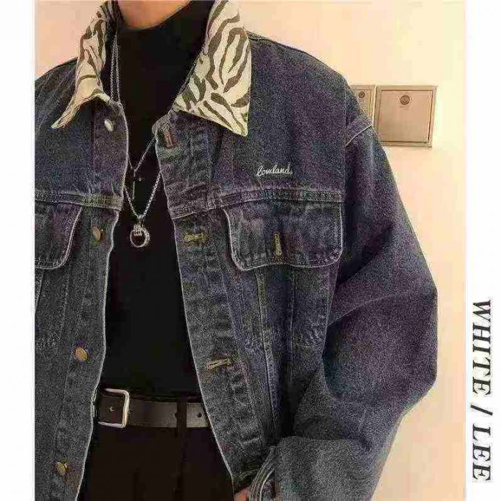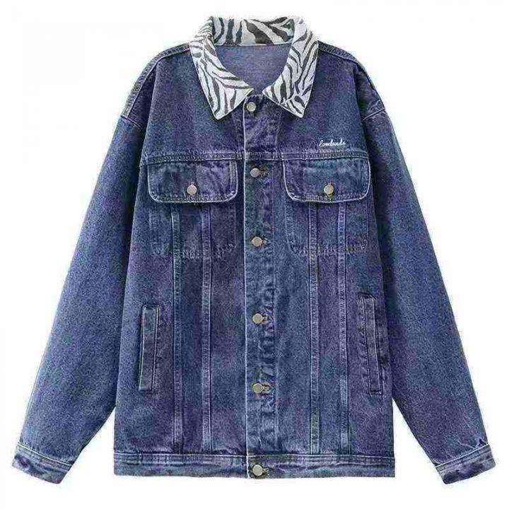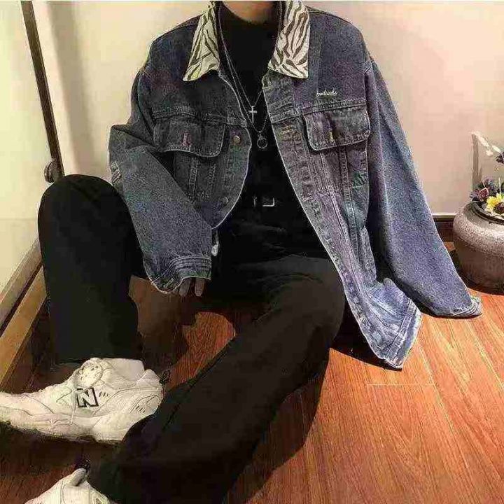 美式复古oversize斑马纹领牛仔外套男生秋季高街潮牌宽...