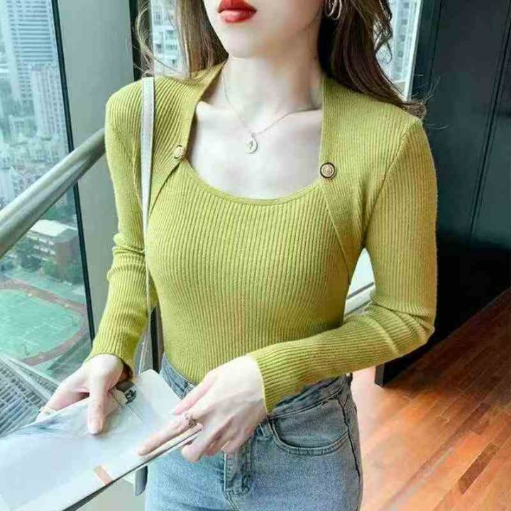 春秋季新款法式方领弹力修身显瘦包芯纱套头毛衣,独立...