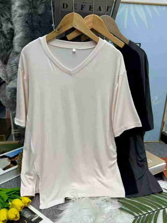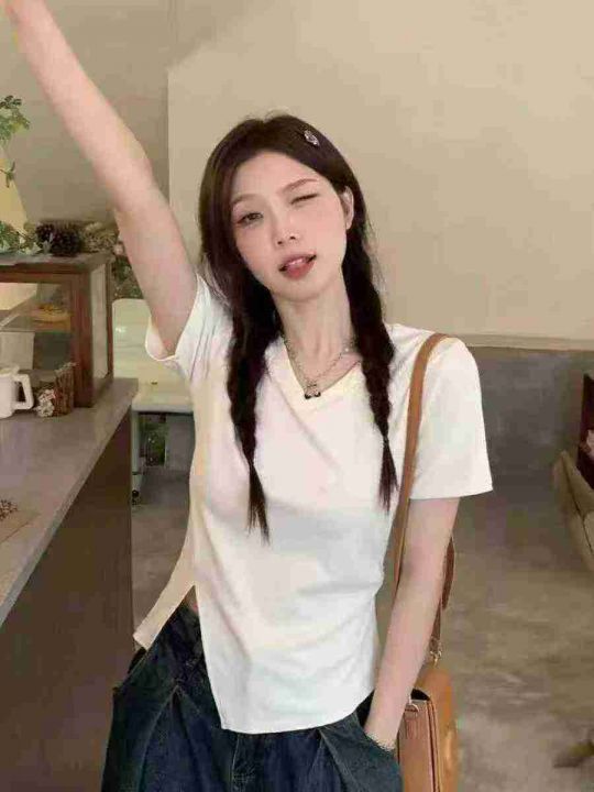 捡漏469件辣妹V领设计感不规则开叉短袖T恤女夏季遮肚子显瘦上衣,独立包装,码数1-4码,丝光棉,弹力大,货号1110#11