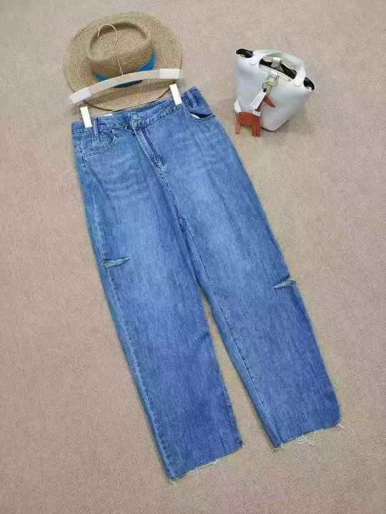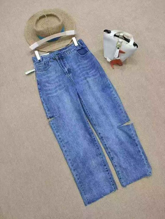 [月亮]:斜扣破洞潮流直筒软面料牛仔裤