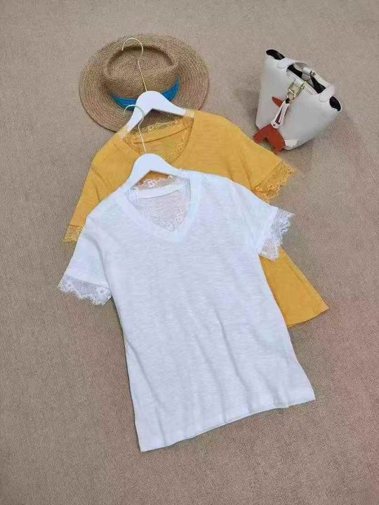 [月亮]:美式设计感蕾丝拼接休闲短袖
