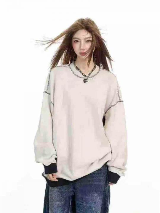 ☕️纯棉毛圈卫衣美式复古圆领拼接撞色插肩卫衣女春秋...
