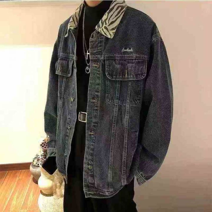 美式复古oversize斑马纹领牛仔外套男生秋季高街潮牌宽...