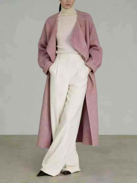 91件秋冬韩系高级粉色毛呢时尚中长款法式复古毛呢外套...