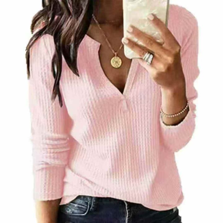 全清4.9蝶宝嘻 v领粉红色上衣修身显瘦秋冬百搭长袖打...