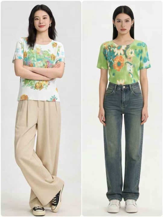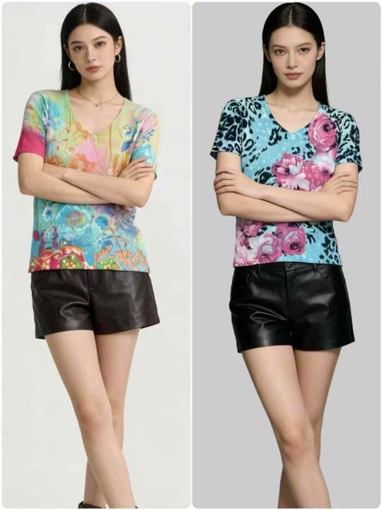 全清:6.8时尚洋气V领/圆领印花针织短袖上衣,小整花...
