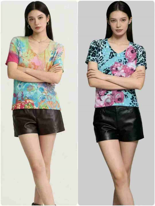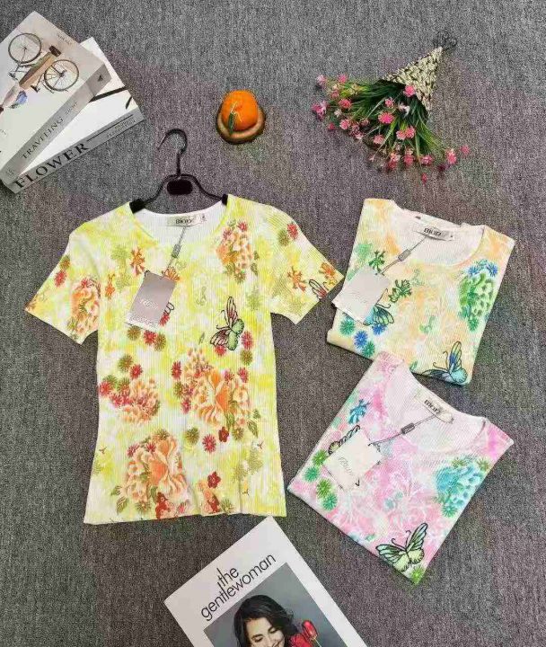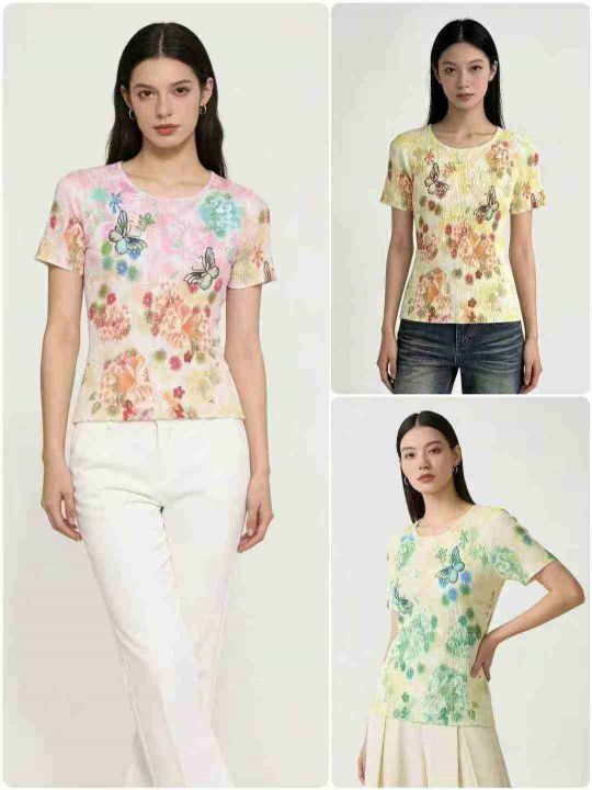 全清:6.8时尚洋气V领/圆领印花针织短袖上衣,小整花...