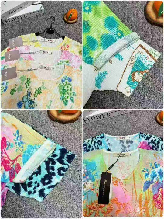 时尚洋气V领/圆领印花针织短袖上衣,小整花型图案多,品质好,数量:300件左右,码数:M-L,有独立包装。