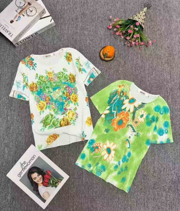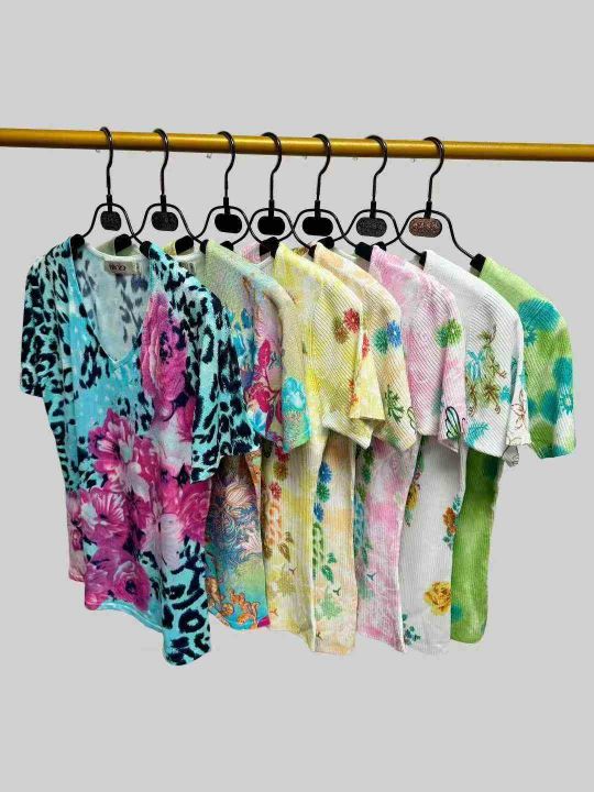 时尚洋气V领/圆领印花针织短袖上衣,小整花型图案多,品质好,数量:300件左右,码数:M-L,有独立包装。