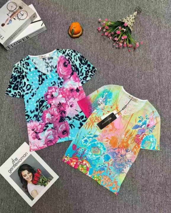 全清:6.8时尚洋气V领/圆领印花针织短袖上衣,小整花...