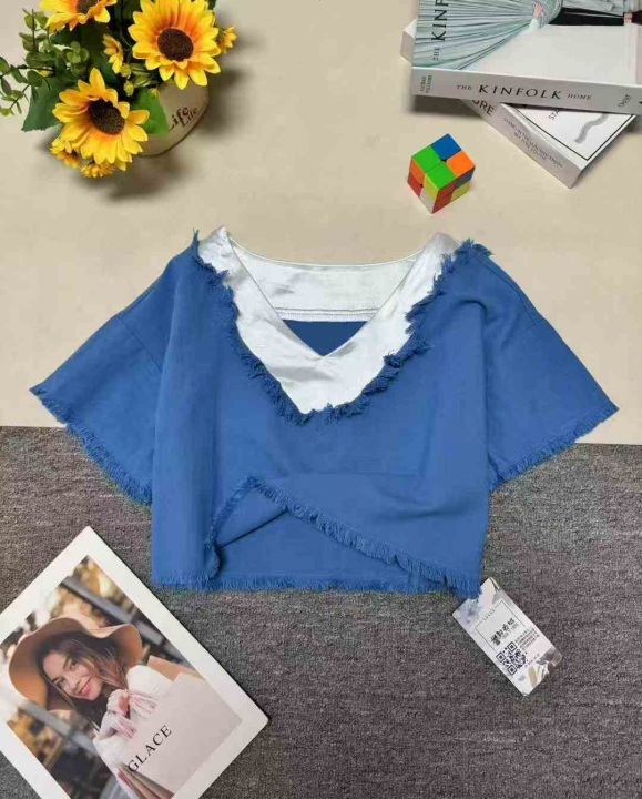 蓝白撞色v领流苏漂亮独特网红款短袖上衣,单款单色,品质好,有独立包装带吊牌,码数S- XL,数量640件左右,全清5.8元秒,分货➕1。