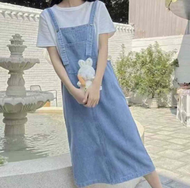 春秋新款洗水棉网红复古蓝牛仔背带长裙,独立包装,3...