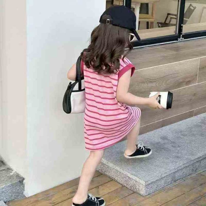 230件左右女童无袖粉色条纹长款T恤韩版夏季2025新款儿...