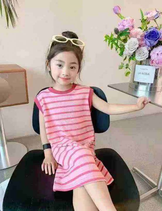 230件左右女童无袖粉色条纹长款T恤韩版夏季2025新款儿...