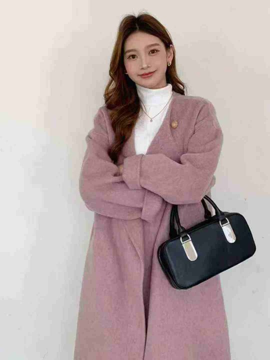 91件秋冬韩系高级粉色毛呢时尚中长款法式复古毛呢外套...