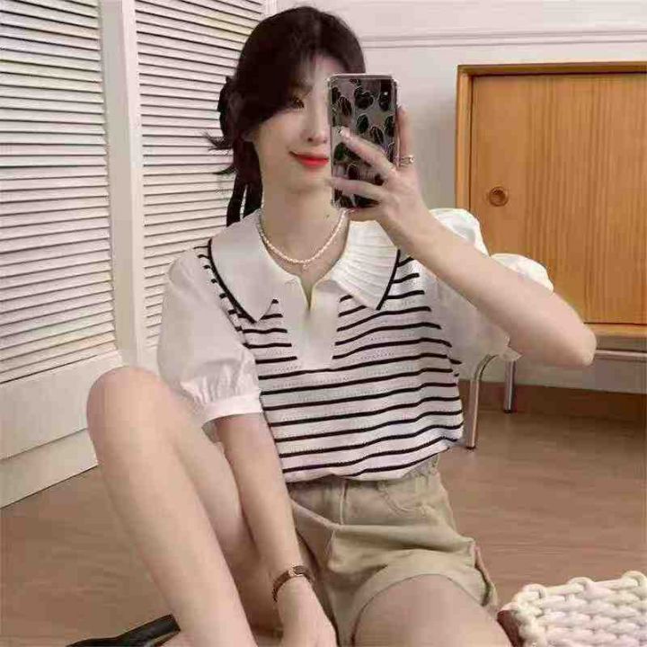 夏季新款冰丝条纹Polo领假两件雪纺拼接袖针织短袖T桖...