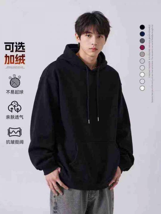 ☕️美式重磅纯色加绒连帽卫衣男女秋冬宽松加绒情侣纯...