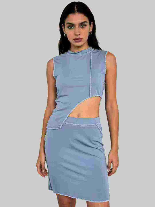 7.5清2077款欧美洋气不规则线条无袖上衣+线条半身裙两...