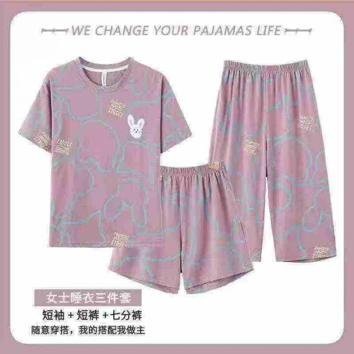 夏季女士薄款高级感三件套棉睡衣可外穿短袖短裤七分裤家居服,独立包装带吊牌,数量296套,尺码M-3XL