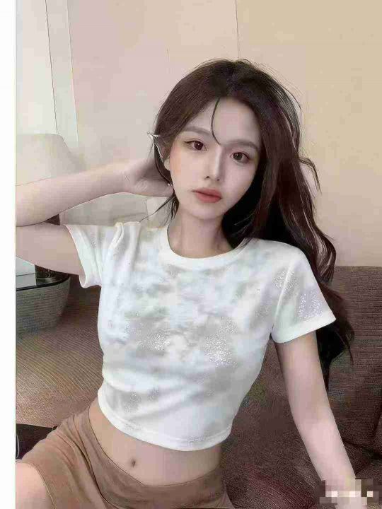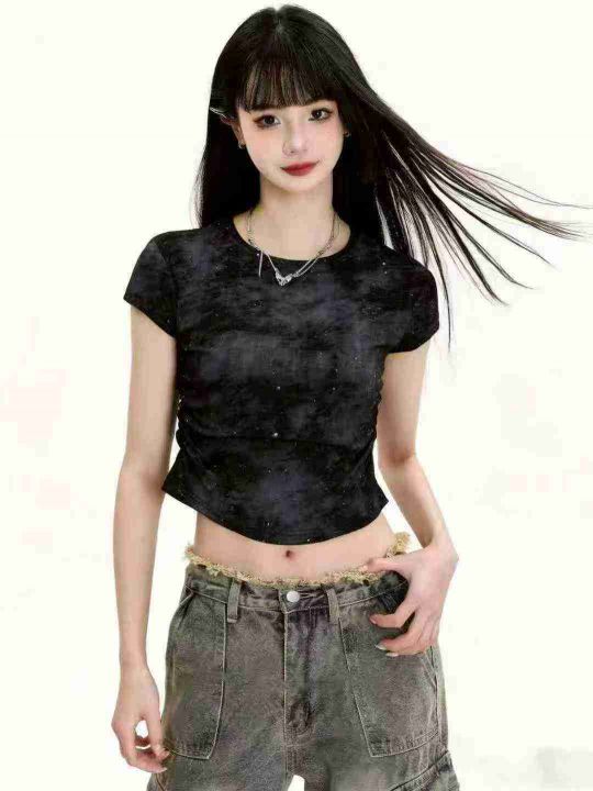 全清价6.5美式烫钻亮片闪闪扎染收腰短袖短款上衣辣妹T...