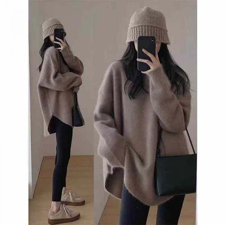 秋冬新款净版简约宽松慵懒风大板包芯纱圆领套头毛衣,...
