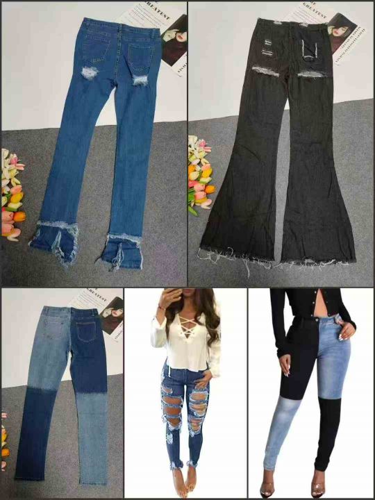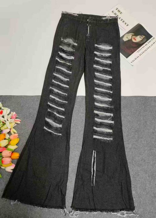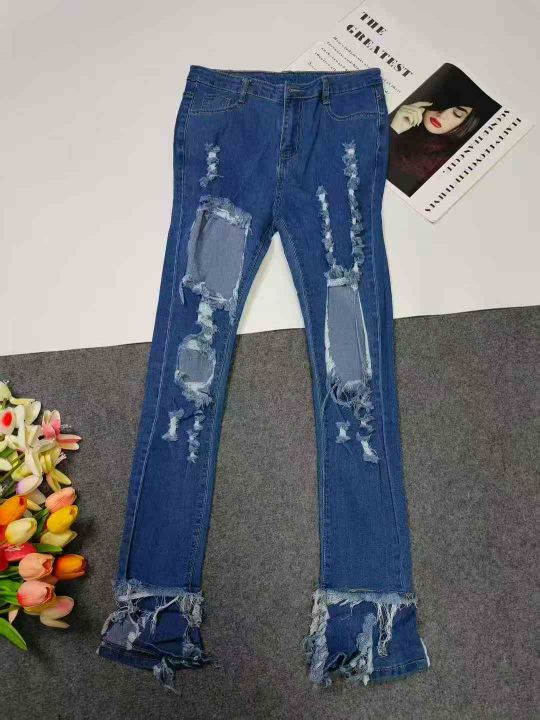 欧美时尚休闲破洞烧花个性街头潮流喇叭牛仔长裤,图片款式,数量600条左右,码数S-2XL,有弹力品质好,有独立包装。