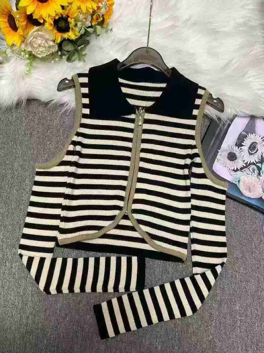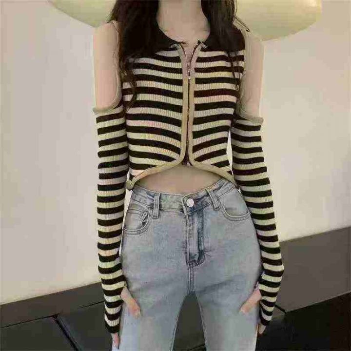 捡漏款,春秋季新款短款显瘦polo领纯欲风复古条纹露肩长袖针织开衫,独立包装,均码面料柔软舒适弹力大,68件,全清6.9元超低价秒杀!