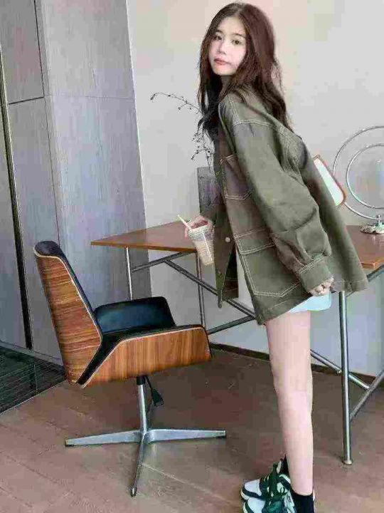 复古宽松军绿色工装翻领长袖牛仔外套,单款单色,独立...