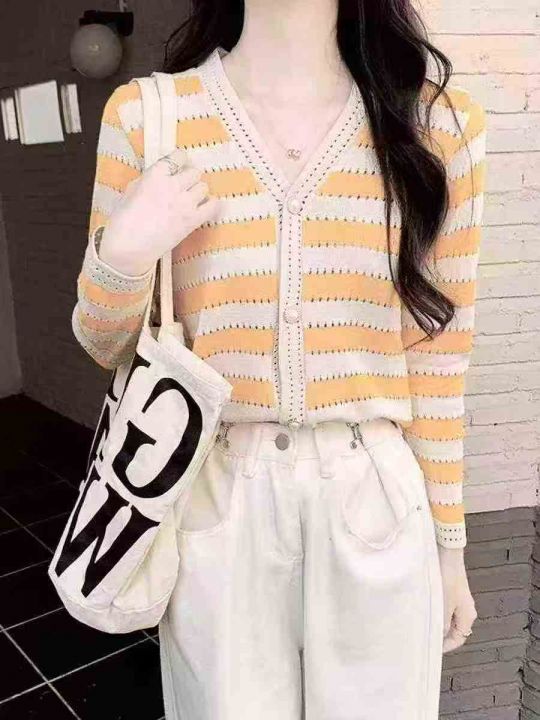 秋季条纹v领宽松小香风设计感遮肚显瘦长袖针织开衫,独立包装,均码面料柔...