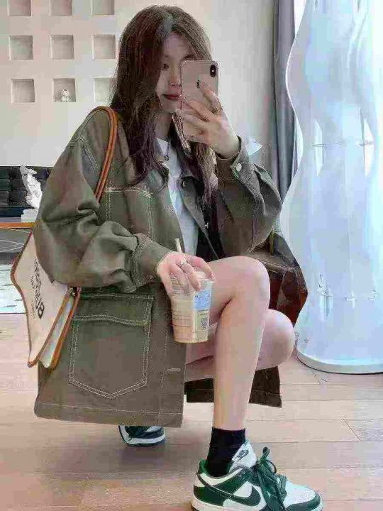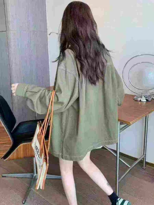 复古宽松军绿色工装翻领长袖牛仔外套,单款单色,独立包装,数量165,XS-L码,福利价9.9秒杀(601)