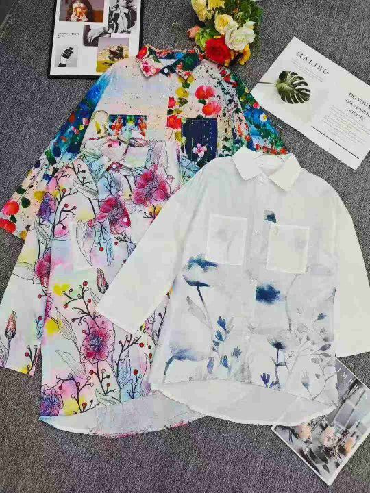 工厂回收357件外贸女士宽松大版印花长袖衬衫,码数S-2XL。版型质量好,颜色丰富鲜艳,货品新,有独立包装。分货➕1