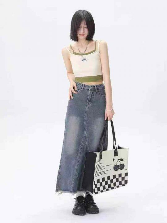 [月亮]:日系复古撞色假两件辣妹吊带上衣