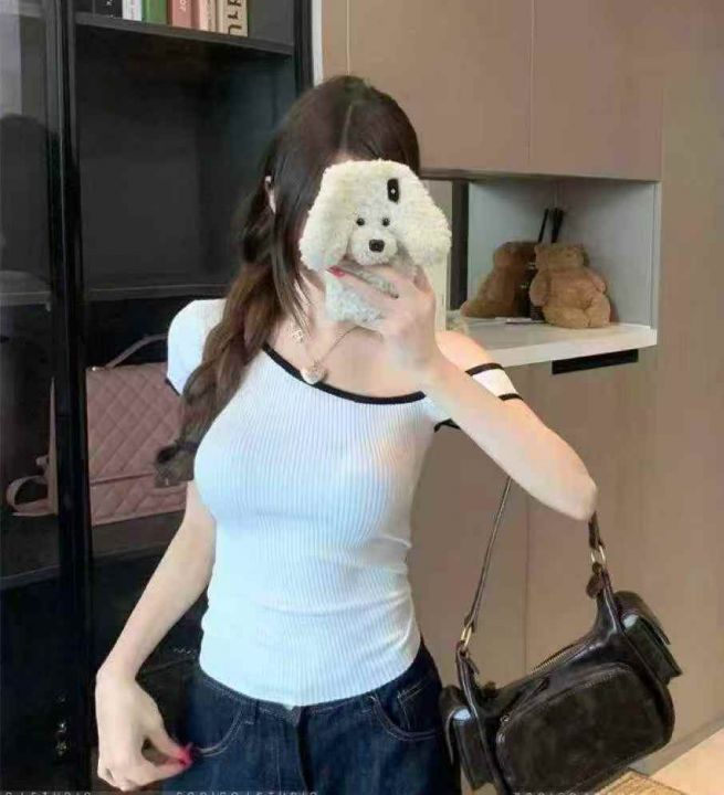 辣妹斜肩针织短袖461件5.9,面料柔软高弹力,品质,撞色设计,不对称设计,...