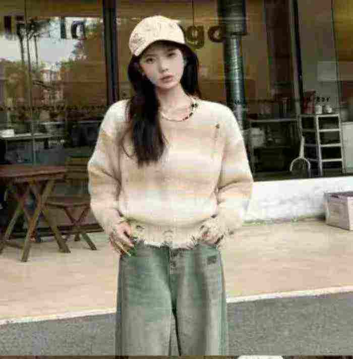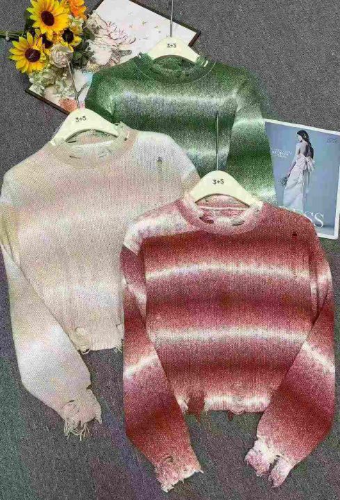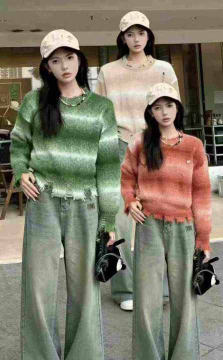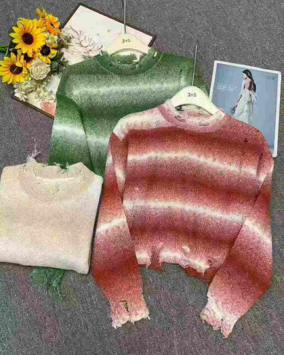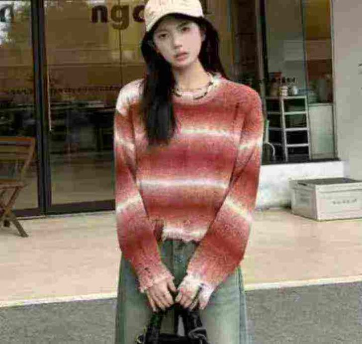 秋冬新款渐变撞色条纹短款宽松慵懒风针织套头毛衣,独...