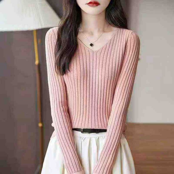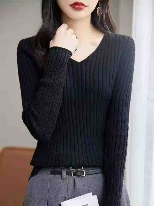 秋冬新款净版简约百搭坑条V领包芯纱套头毛衣,独立包...