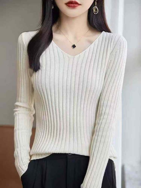 秋冬新款净版简约百搭坑条V领包芯纱套头毛衣,独立包...