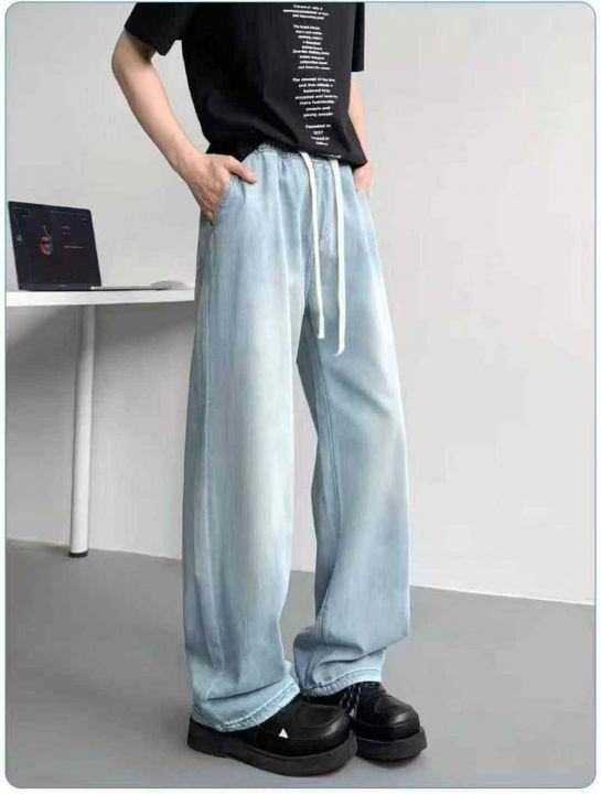 春秋新款松紧腰男女同款直筒阔腿牛仔裤,独立包装带腰...
