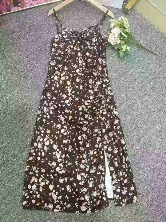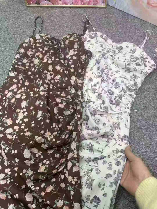 温柔风紫色碎花连衣裙女收腰显瘦小个子吊带裙,模特供参考,整款2色,1到4码,2码裙长105,独立包装,货品干净,570左右,7.8清,分货加1