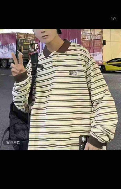 男装春秋季新款减龄POLO领条纹纽扣卫衣宽松休闲上衣,...