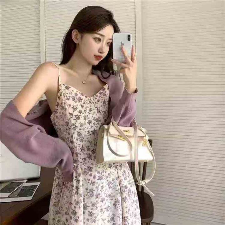 温柔风紫色碎花连衣裙女收腰显瘦小个子吊带裙,模特供...