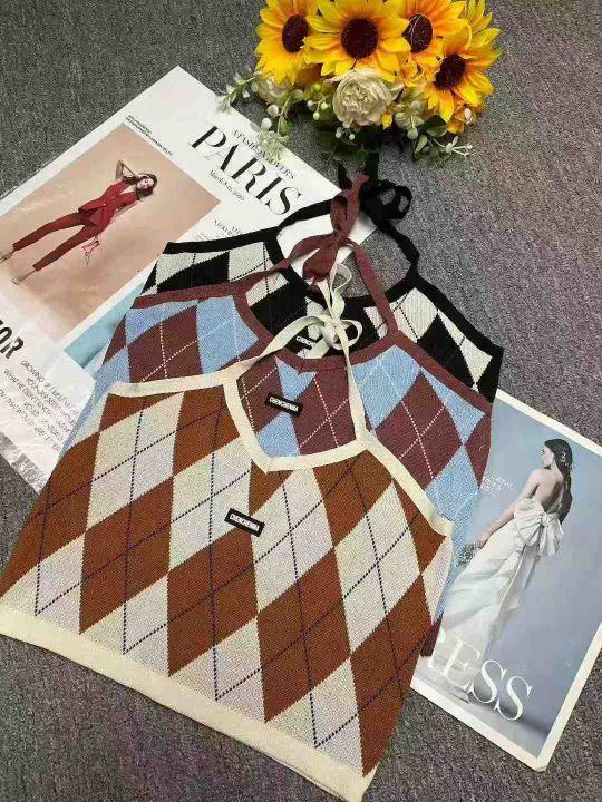 春夏新款复古菱格辣妹小标挂脖针织吊带背心独立包装,...