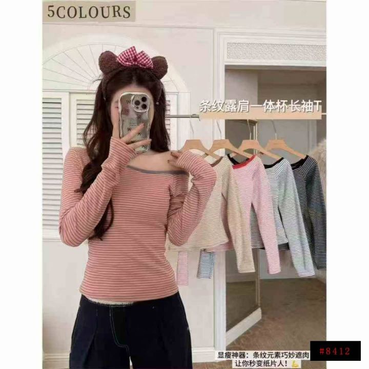 秋冬新款性感辣妹设计款撞色条纹长袖显瘦包芯纱针织套...