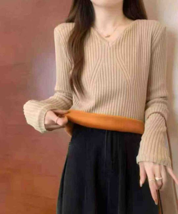 冬季新款加绒加厚美拉德色系V领坑条包芯纱套头毛衣,...