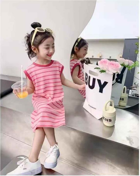 230件左右女童无袖粉色条纹长款T恤韩版夏季2025新款儿...
