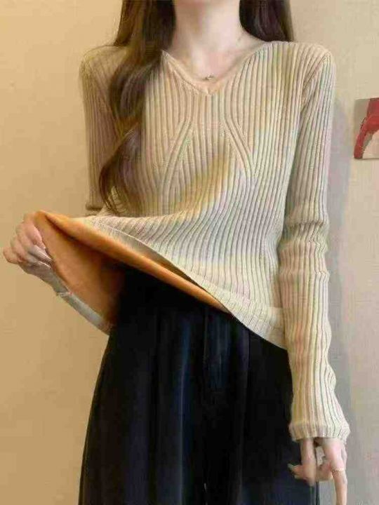 冬季新款加绒加厚美拉德色系V领坑条包芯纱套头毛衣,...