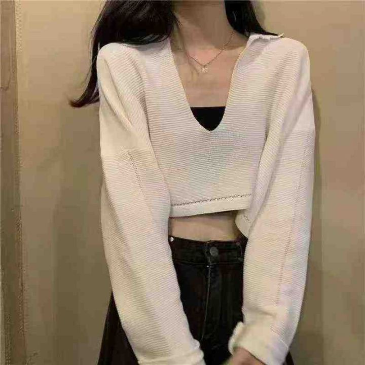 秋季新品法式宽松短款慵懒v领长袖针织衫特+针织抹胸2...