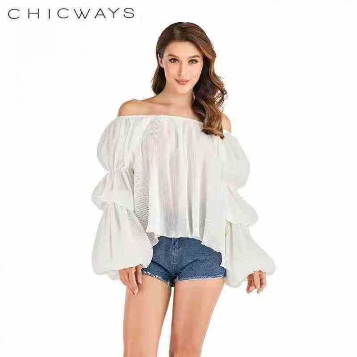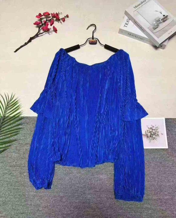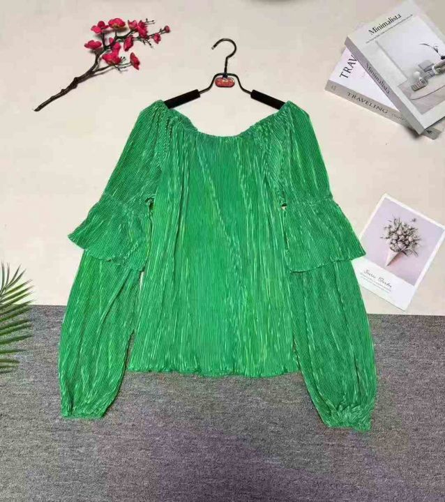 一字领露肩灯笼袖宽松显瘦条纹压褶泡泡袖上衣女,整款五色,数量122件,码数1XL-5XL,品质好,有独立包装。